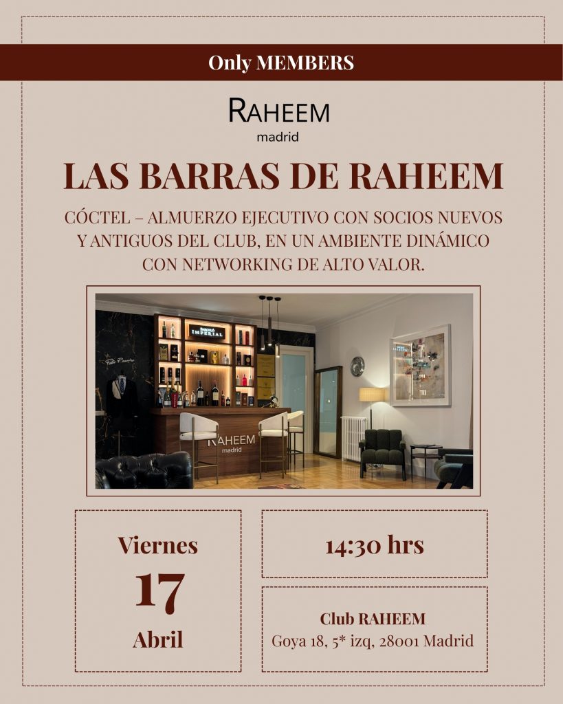 Nos complace informarle que, a partir del viernes 21 de noviembre, el Club implementará un nuevo formato de evento -Las Barras de RAHEEM- orientado a fortalecer el networking de alto valor entre nuestros asociados y promover un mayor intercambio profesional.