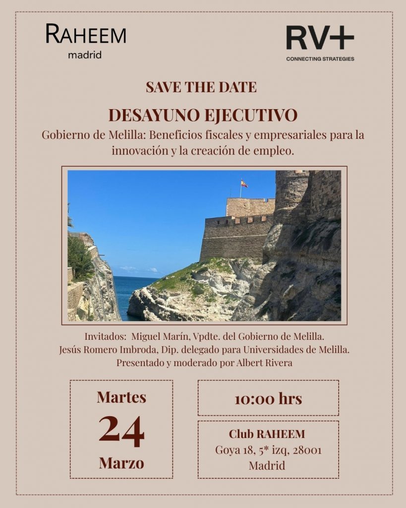 En Club RAHEEM nos complace invitarle a una nueva edición de Desayunos Ejecutivos, con la participación de Miguel Marín, Vicepresidente del Gobierno de Melilla, y Jesús Romero Imbroda, Diputado Delegado para Universidades, presentado por nuestro Presidente Albert Rivera. El encuentro abordará las ventajas fiscales de la Ciudad Autónoma de Melilla, aplicables a cualquier empresa, con un enfoque especial en compañías tecnológicas y digitales, dada su capacidad de expansión y deslocalización.
