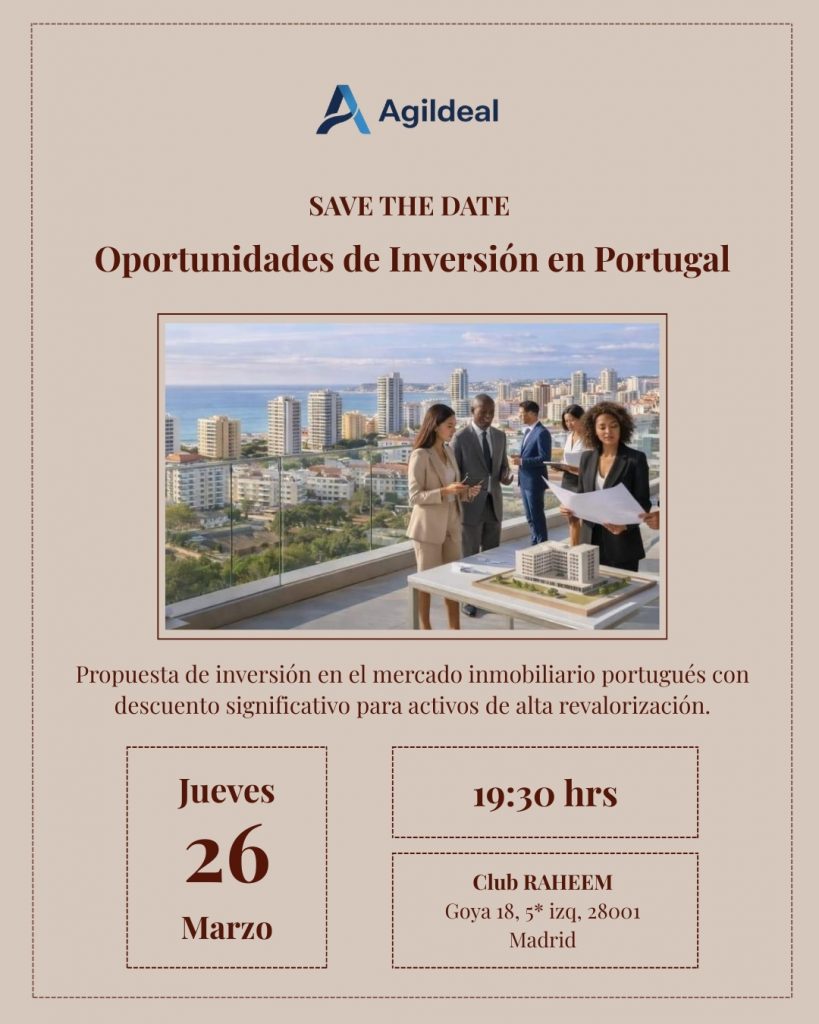 Nuestro partner portugués Agildeal le invita a un exclusivo evento que combinará la presentación de oportunidades de inversión inmobiliaria en Portugal, con acceso a activos de alto potencial y condiciones preferentes, en un ambiente de networking con socios de alto valor, ideal para establecer conexiones estratégicas en un mercado sólido y en crecimiento.