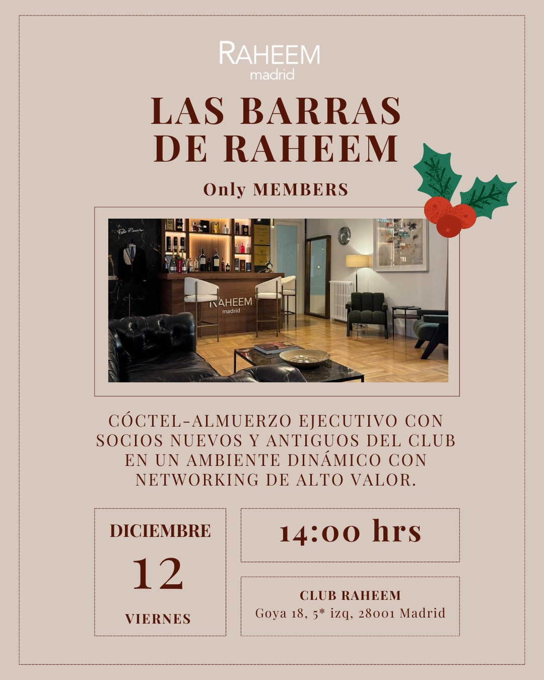 Nos complace extenderles una cordial invitación a un cóctel-almuerzo ejecutivo exclusivo, organizado con motivo de celebrar la llegada de la Navidad, en el marco de nuestra segunda sesión de “Las barras de RAHEEM”.