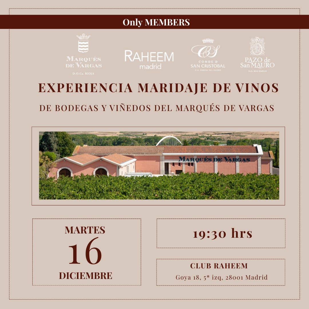 Las Bodegas y Viñedos Marqués de Vargas, partner enológico de Club Raheem, nos ofrecerán una cata de sus mejores vinos maridados con productos gourmet.