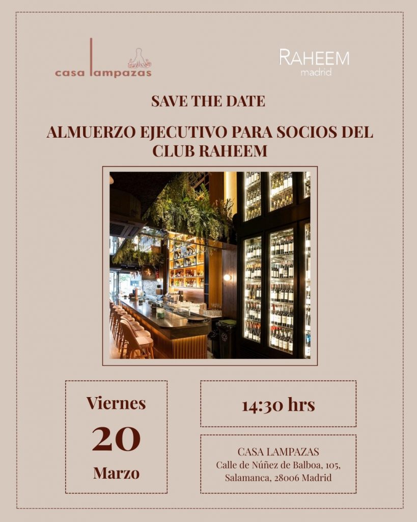 Es un placer invitarles a nuestro Almuerzo ejecutivo de los viernes para socios de Club RAHEEM en Ceferino, un espacio distinguido que nos abrirá sus puertas para brindarnos una experiencia gastronómica excepcional donde compartiremos un espacio de diálogo y networking de alto valor en un ambiente único.